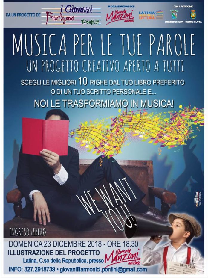 Torna “Musica per le tue parole”, l’iniziativa musicale nata da un’idea dell’associazione “I Giovani Filarmonici Pontini” in collaborazione quest’anno con “La Libreria Manzoni” di Latina che insieme vogliono promuovere la lettura attraverso la musica spronando i lettori e gli “scrittori” pontini e non solo a prendere le dieci righe più significative del libro preferito o di uno scritto personale per trasformarle in una canzone. Il progetto sarà illustrato da “I Giovani Filarmonici Pontini”, alle ore 18.30 domenica 23 dicembre davanti “La Libreria Manzoni” in corso della Repubblica a Latina. Il progetto “Musica per le tue parole” gode del patrocinio della Provincia e del Comune di Latina ed è inserito nell’ambito del progetto “Patto per la Lettura”, iniziativa che vede nella lettura una risorsa strategica; inoltre diverse scuole di Latina e provincia hanno ritenuto talmente valida l’iniziativa da inserirla nel Piano triennale dell’offerta formativa. L’obiettivo della kermesse aperta a tutti, dai più piccoli ai più grandi, è raccogliere testi, proposti e selezionati, in un audiobook, il cui ricavato sarà destinato ad incrementare le biblioteche delle scuole di Latina e della nostra provincia. L’idea prende spunto dal progetto “Io leggo perché …” ed ha lo scopo di far interagire tutti i lettori dai 0 ai 100 anni con musicisti, compositori, band e gruppi musicali di Latina e della nostra provincia. Saranno i “I Giovani Filarmonici Pontini”, diretti dal maestro Stefania Cimino, che faranno da ponte, senza confini di età, tra la lettura e la musica. Per partecipare ed essere fra i protagonisti dell’audio libro della Quarta edizione, basta consegnare, un proprio pensiero, una poesia, un elaborato o 10 righe più significative del libro del cuore, entro il 19 Gennaio. I punti di raccolta sono delle scatole facilmente individuabili nei punti strategici della città, nelle scuole, in Biblioteca e ovviamente a La Libreria Manzoni di Latina. L’elaborato dovrà indicare, oltre alle generalità, un recapito telefonico e una mail e potrà essere lasciato nei vari box oppure spedito a giovanifilarmonici.pontini@