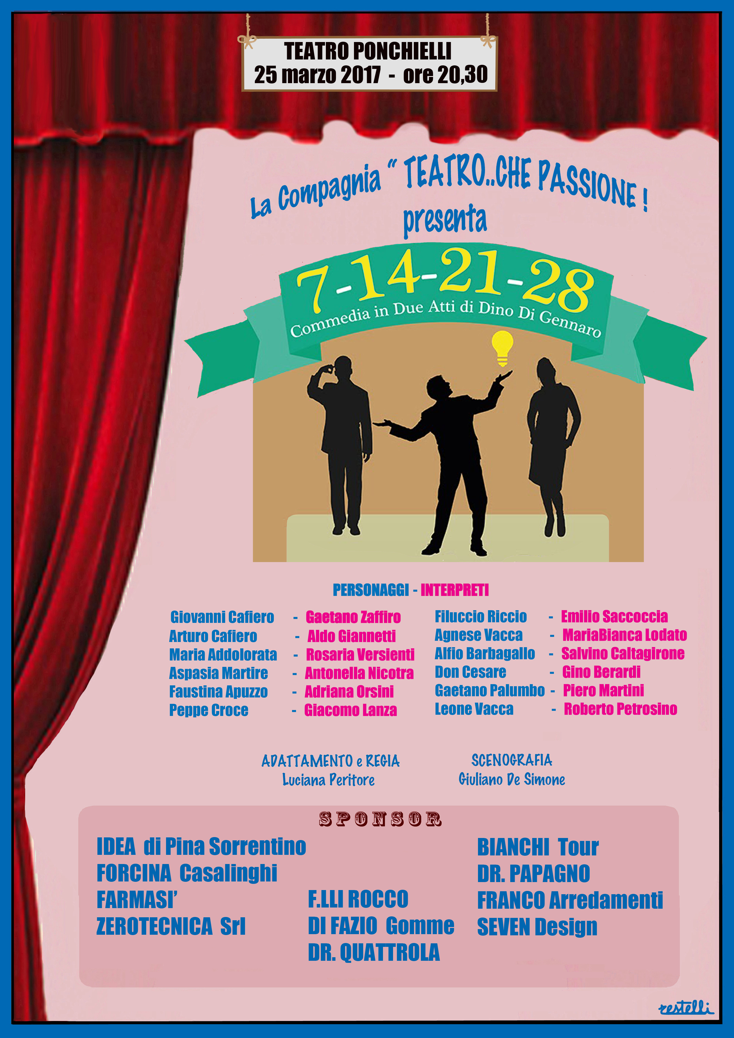 Sabato 25 marzo, sul palco del Ponchielli a Latina, c’è un gradito ritorno: la compagnia Teatro…che passione con la commedia “7-14-21-28”. Appuntamento alle 20,30, con una commedia in due atti dell’autore napoletano Dino De Gennaro, ambientata ai giorni nostri in una città italiana, che racconta la storia di vita di due fratelli, che per puro interesse economico decidono di prendersi gioco di una vedova piuttosto “vogliosa”, facendole credere di poter costruire una “macchina atomica reincarnamorti” che sarebbe in grado di far rivivere il coniuge defunto. Attorno ai due fratelli ruota una serie di personaggi molto divertenti: dalla sorella alla vicina di casa, ambedue zitelle ed estremamente religiose, dal parroco esorcista al creditore ‘guappo’ di uno dei due, dal letturista del gas alla giovane e disinvolta signora e al suo gelosissimo marito i quali, in un susseguirsi di esilaranti situazioni, contribuiscono a rendere tutta la vicenda estremamente divertente. La rappresentazione dura circa un’ora e mezza, non prevede cambi di scena né particolari effetti di luce.