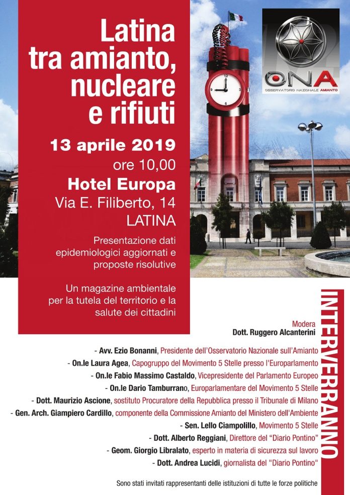 Relatori del convegno Ezio Bonanni, presidente dell’Osservatorio Nazionale sull’Amianto; Laura Agea, capogruppo del Movimento 5 Stelle presso l’Europarlamento; Fabio Massimo Castaldo, vicepresidente del Parlamento Europeo; Dario Tamburrano, europarlamentare del Movimento 5 Stelle; Maurizio Ascione, sostituto Procuratore della Repubblica presso il Tribunale di Milano, Giampiero Cardillo, componente della Commissione Amianto del Ministero dell’Ambiente; il senatore Lello Ciampolillo, Movimento 5 Stelle; Alberto Reggiani, direttore del “Diario Pontino”; Giorgio Libralato, esperto in materia di sicurezza sul lavoro, e Andrea Lucidi, giornalista “Diario Pontino”.