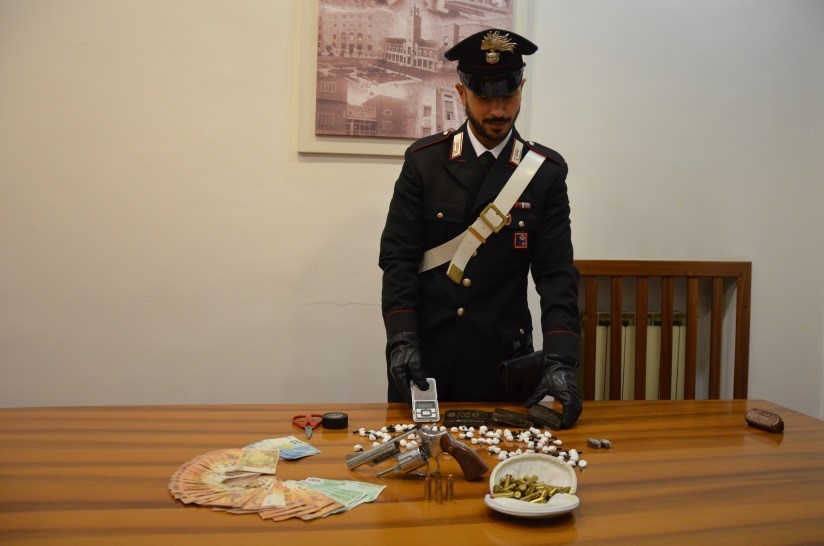Il blitz dei militari è scattato all’interno della sua abitazione che è stata sottoposta a perquisizione. Rinvenuti 370 grammi di hashish, suddivisi in quattro panetti, 100 grammi di cocaina, suddivisa in centro confezioni, un revolver Smith & Wesson calibro 357 magnum in ottimo stato di conservazione, oggetto di furto nell’anno 2015 in provincia di Perugia, 55 proiettili dello stesso calibro, e la somma contante di 4.400 euro ritenuta provento di attività illecita. Il tutto è stato sottoposto a sequestro.