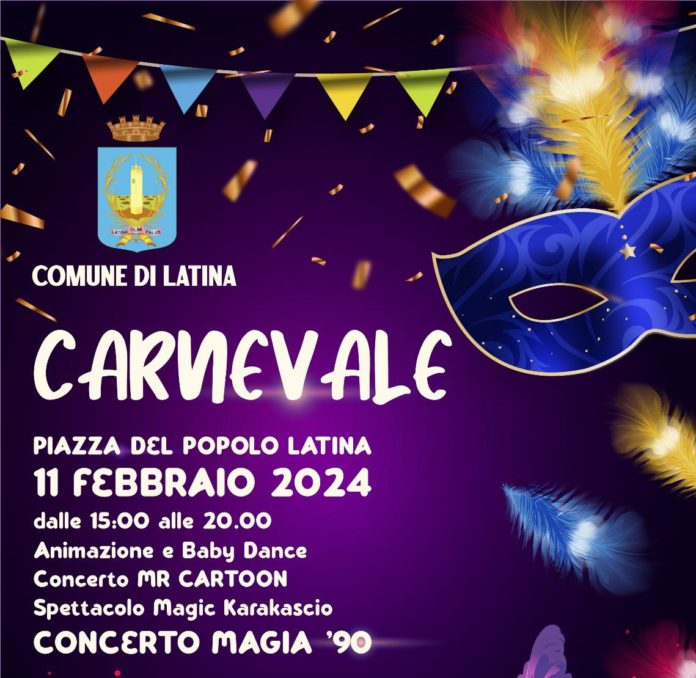 Domenica, 11 febbraio, Latina si vestirà a festa per il Carnevale. L’appuntamento è dalle 15 alle 20 in piazza del Popolo con animazione, baby dance, il concerto Mr Cartoon, lo spettacolo Magic Karakascio e il concerto Magia ’90. Dall’8 febbraio al 14 febbraio, inoltre, ci saranno mercatini, track food e giostre per bambini. In vendita prodotti di Carnevale, di artigianato locale, dolciumi tipici delle festività di Carnevale e, per finire, l’ultimo giorno sarà dedicato alla festa degli innamorati.