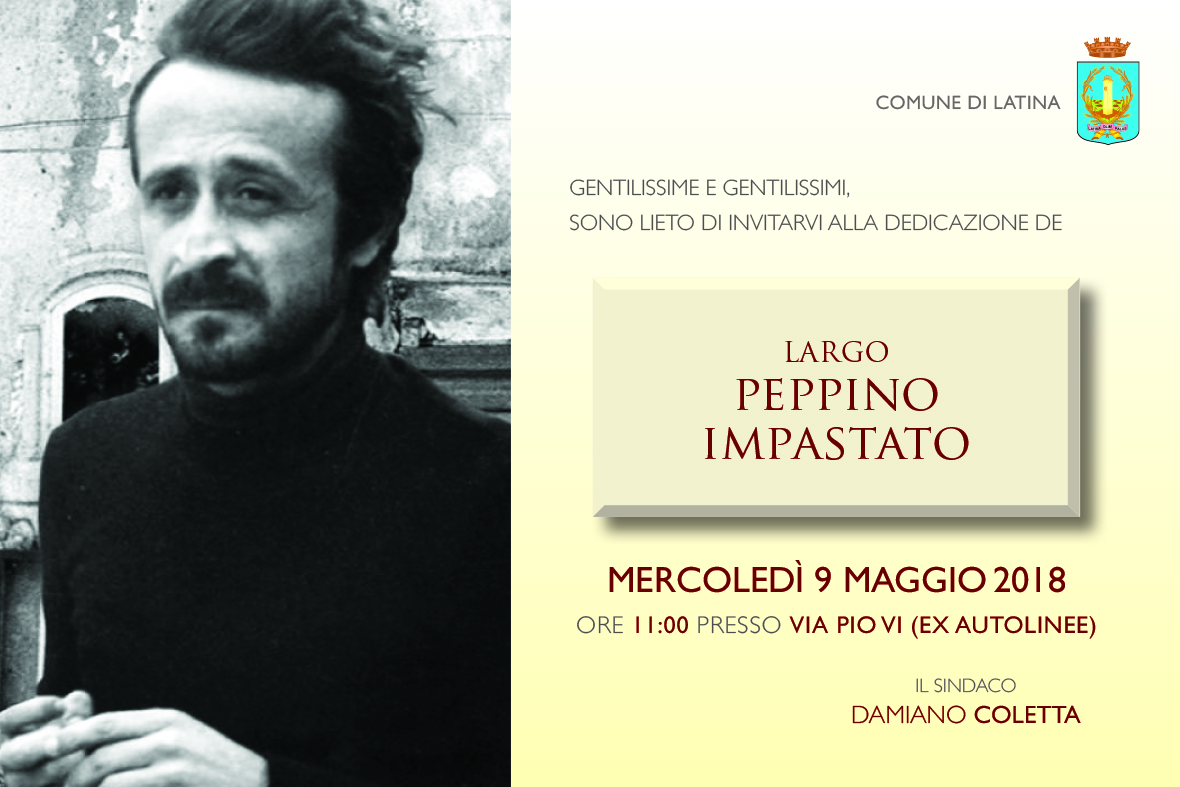 A quarantanni dalla sua tragica morte, Giuseppe Impastato sarà commemorato a Latina con l’intitolazione ufficiale del piazzale antistante le ex autolinee di via Pio VI. Il nome di Impastato è stato inserito nella toponomastica del capoluogo pontino con la delibera approvata all’unanimità nella seduta del Consiglio comunale del 25 settembre 2017. Per dieci anni a rendere omaggio a Peppino Impastato, nello stesso luogo in cui sarà affissa la targa, sono stati i comunisti di Latina con la deposizione di un mazzo di fiori e un cartello recante la scritta della sua lapide: “Giuseppe Impastato, rivoluzionario e militante comunista assassinato dalla mafia democristiana”.