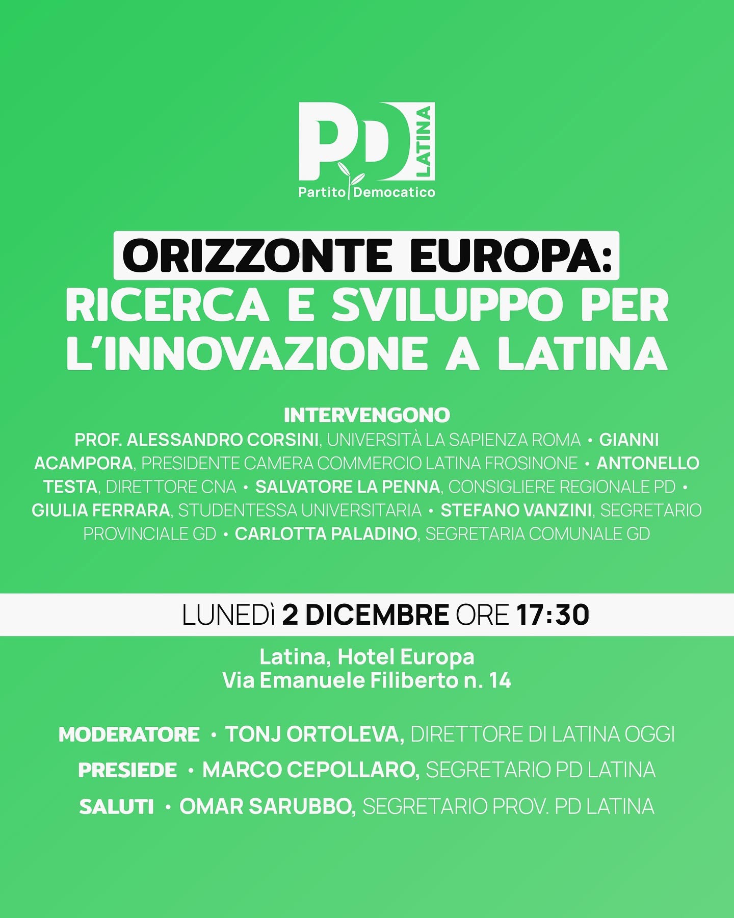Il prossimo lunedì, alle 17:30, presso l’Hotel Europa di Latina, il Partito Democratico organizza un incontro sul potenziamento della ricerca post-universitaria e la collaborazione tra università, imprese e territorio.