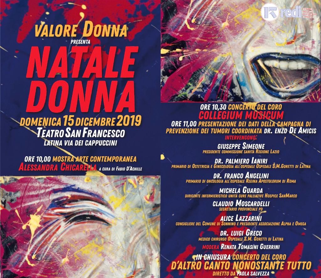 L’iniziativa “Natale Donna” avrà luogo alle 10 presso il teatro San Francesco con la partecipazione di Giuseppe Simeone, presidente della Commissione Sanità presso la Regione Lazio, Palmiero Ianiri, primario di Ostetricia e Ginecologia presso il Santa Maria Goretti, Franco Angelini, primario di Oncologia all’ospedale Regina Apostolorum di Roma, Michela Guarda, dirigente infermieristico presso le Unità palliative dell’Hospice San Marco, Claudio Moscardelli, segretario provinciale del Pd, Alice Lazzarini, consigliere comunale a Sonnino e presidente dell’associazione Alpha e Omega e Luigi Greco, medico chirurgo presso il Santa Maria Goretti di Latina