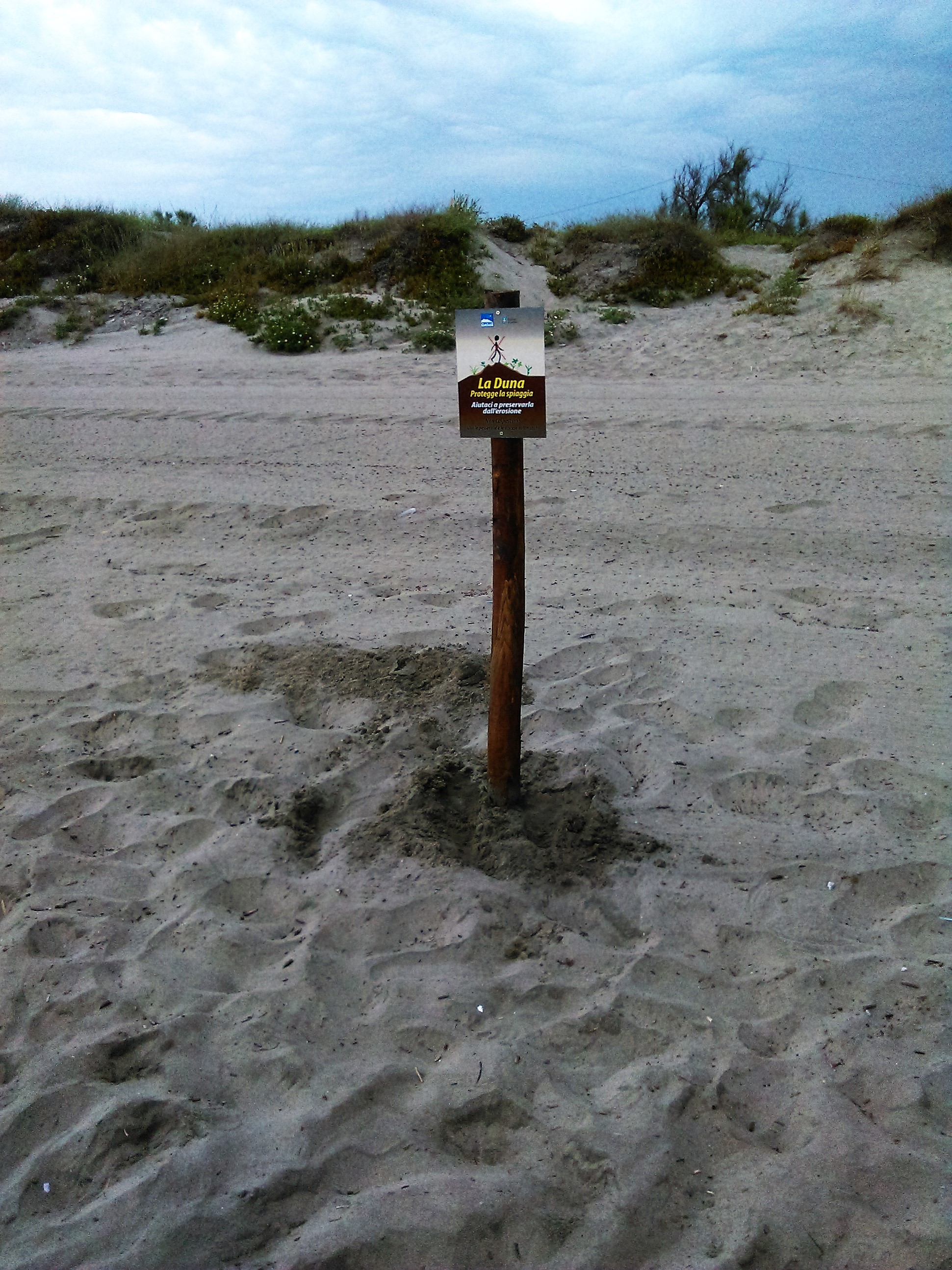 Una serie di pali posti a distanza di circa 100 metri l’uno dall’altro, infissi sulla spiaggia e con affisso un cartello che invita a non calpestare la duna e a usare le passerelle e i passaggi autorizzati.