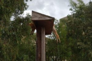 Una volpe morta lasciata come un trofeo sopra un cartello del parco “Oasi Verde”, di via Pierluigi Nervi, nel quartiere Q4, a Latina, sul lato dei palazzi Ater. Un “volpacchiotto” scrivono le guardie zoofile che si sono occupate di recuperarlo e di affidarlo ad un veterinario che svolgerà l’autopsia per capire come sia morta.