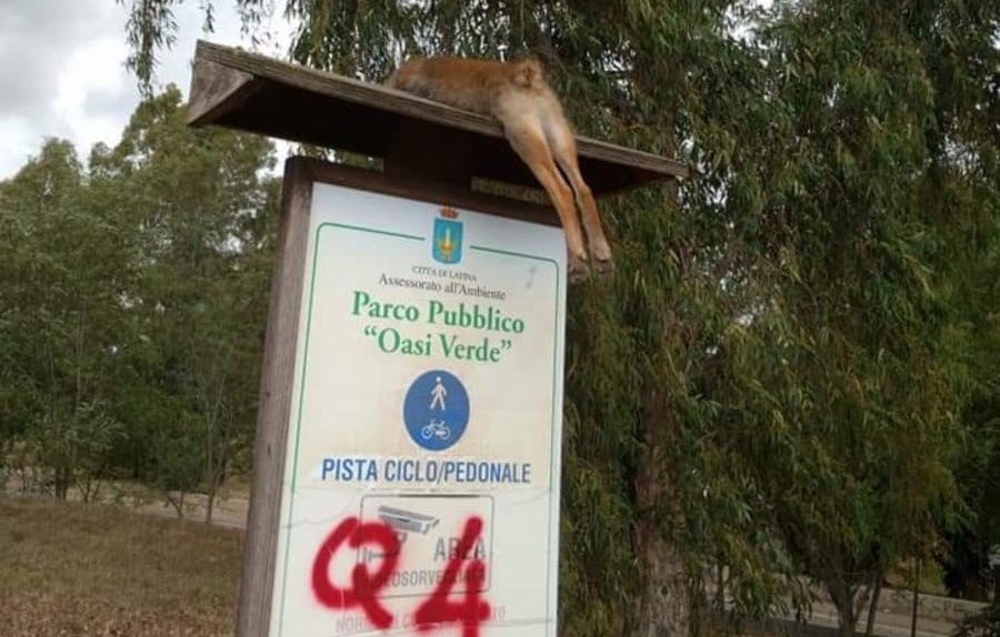 Una volpe morta lasciata come un trofeo sopra un cartello del parco “Oasi Verde”, di via Pierluigi Nervi, nel quartiere Q4, a Latina, sul lato dei palazzi Ater. Un “volpacchiotto” scrivono le guardie zoofile che si sono occupate di recuperarlo e di affidarlo ad un veterinario che svolgerà l’autopsia per capire come sia morta.
