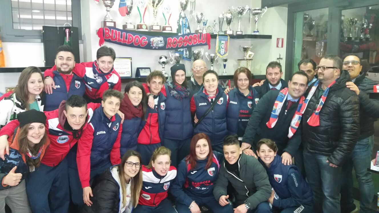 Entrando nello specifico bisogna evidenziare la ritrovata forma di alcune atlete rossoblu come: Michela Sacchetti che ha concesso all’attacco avversario rarissime occasioni; Arianna Valluzzi che sopratutto nel primo tempo è stata presente su ogni giocata con vigore e temerarietà; la ungherese Uveges che nello specifico, oltre ad aver ispirato molte giocate è stata protagonista di un paio di ‘sombreri’ che hanno deliziato il folto pubblico presente; Claudia Monti, portiere al suo rientro dopo diverse gare, si è fatta trovare pronta dalle poche, ma incisive iniziative delle ospiti. Grande plauso anche per il capitano Marika Colantuono, che come sempre è più di sempre ha lottato su ogni singolo pallone. Sipario molto simpatico in tribuna, dove tra i tifosi rossoblu si è distinta la presenza del noto giornalista e conduttore radiofonico Corrado Gentile del network RDS. Gentile che nei giorni scorsi aveva salutato e incoraggiato le atlete in diretta radiofonica, invitato dalla società, dopo aver assistito al match si è intrattenuto con la squadra per i festeggiamenti di rito (sopra la foto).