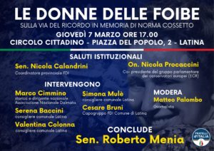 Le Donne delle Foibe”, questo il titolo del convegno organizzato da Fratelli d’Italia Latina per giovedì 07 marzo, alle ore 17.00, presso il Circolo Cittadino di Piazza del Popolo.