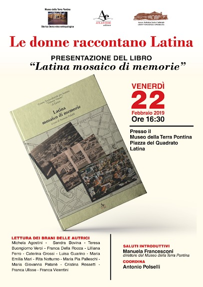 Sarà presentato venerdì 22 febbraio, alle 16.30, presso il museo Terra Pontina a Latina, il libro curato da Antonio Polselli “Latina mosaico di memorie”, pubblicato da Atlantide, casa editrice diretta da Dario Petti. Autrici quattordici donne che attraverso i loro racconti hanno narrato il loro rapporto con il capoluogo pontino, il loro arrivo, il primo impatto, il percorso di integrazione, pregi e difetti di quella che è la loro città.