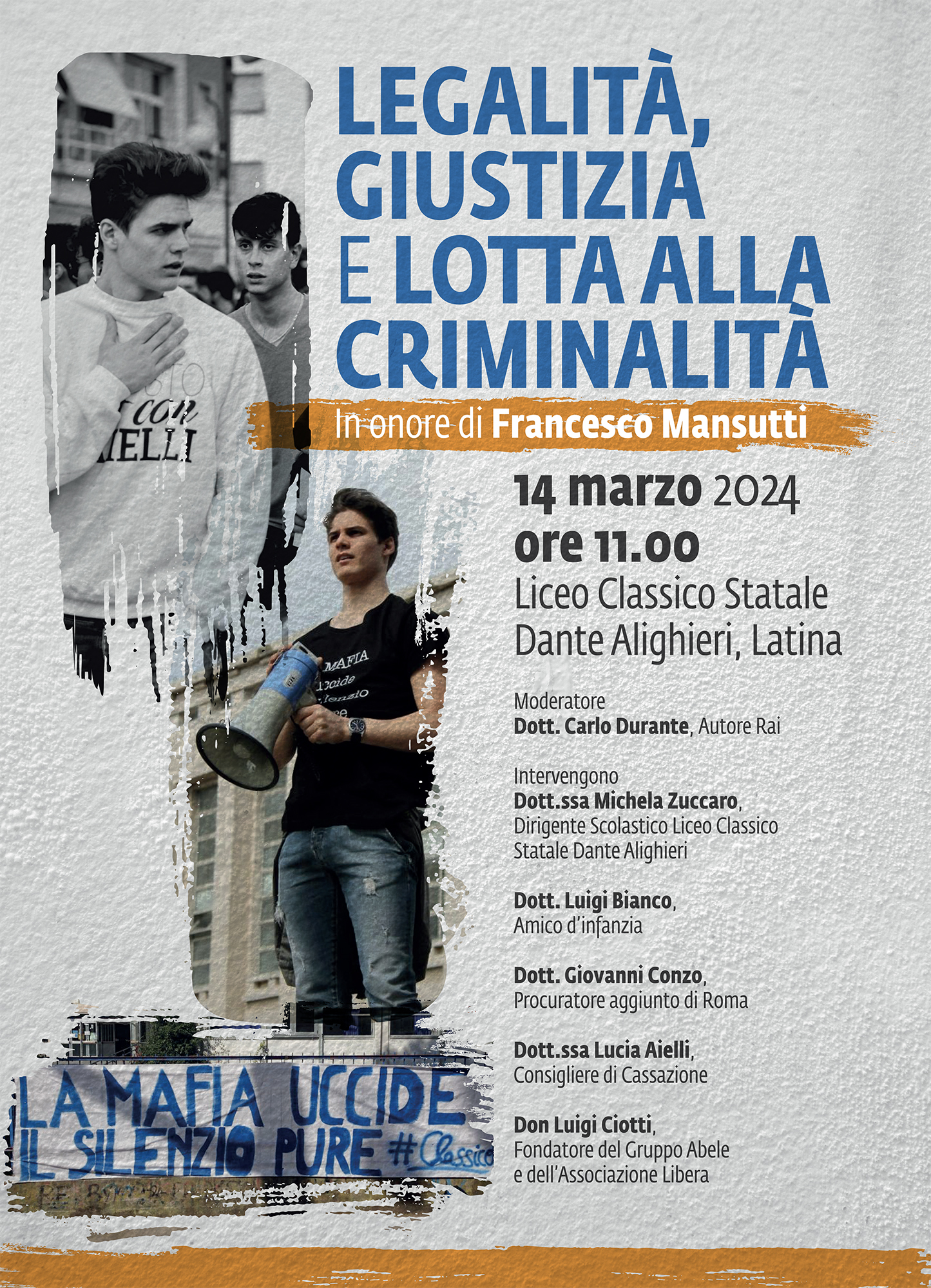 Un importante evento dedicato alla legalità, alla giustizia e alla lotta contro la criminalità. Sono i temi che domani saranno oggetto della conferenza al Liceo Classico “Dante Alighieri” di Latina in memoria di Francesco Mansutti, ragazzo pontino prematuramente scomparso un anno fa.