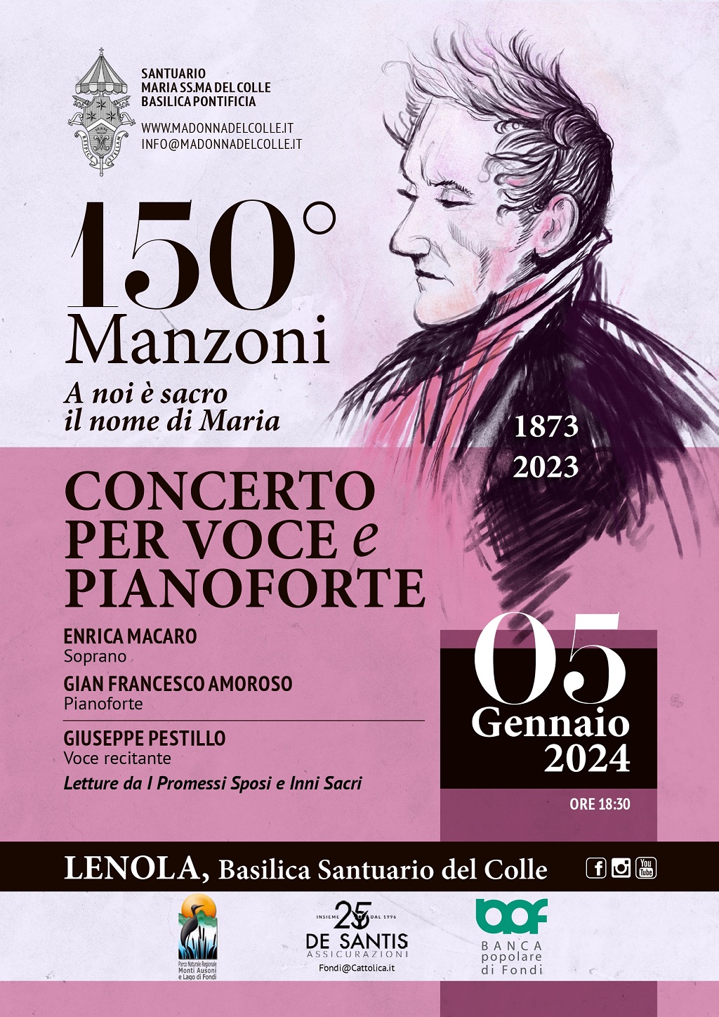 Appuntamento a domani a Lenola, Basilica Santuario della Madonna del Colle conclusione delle celebrazioni, alle ore 18.30 per il 150° anniversario della morte di Alessandro Manzoni con letture dai Promossi sposi e Inni Sacri dedicati alla Vergine Maria e Concerto per voce e pianoforte.