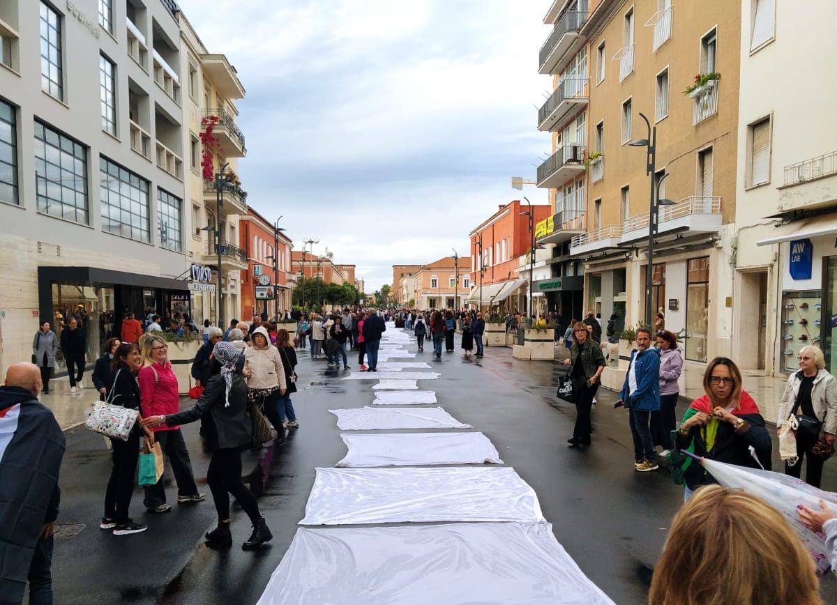 Lenzuola bianche stese a terra per rappresentare idealmente i sudari nel quale vengono avvolti i corpi dei palestinesi uccisi nella guerra di Gaza. Un immagine semplice ma che va oltre e che esprime un senso di solidarietà ad una popolazione martoriata dai venti di guerra che ormai vanno avanti da troppo tempo e che finora conta almeno 55mila morti tra cui 15mila bambini.