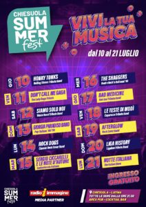 Ogni sera, a partire dalle ore 21:30, il festival ospiterà una cover o tribute band diversa, regalando al pubblico un viaggio sonoro che spazia tra generi e decenni: dal pop al rock, dal beat al rap, fino al grande cantautorato. Una proposta musicale ampia e trasversale che ripercorre i migliori successi di sempre, italiani e internazionali, pensata per coinvolgere un pubblico eterogeneo e capace di unire diverse generazioni attorno alla passione per la musica dal vivo. Perché il Chiesuola Summer Fest è un momento di aggregazione, intrattenimento e cultura musicale, nato per valorizzare gli artisti e interpreti locali e per dare voce e spazio a tributi che hanno fatto – e continuano a fare – la storia della musica.
