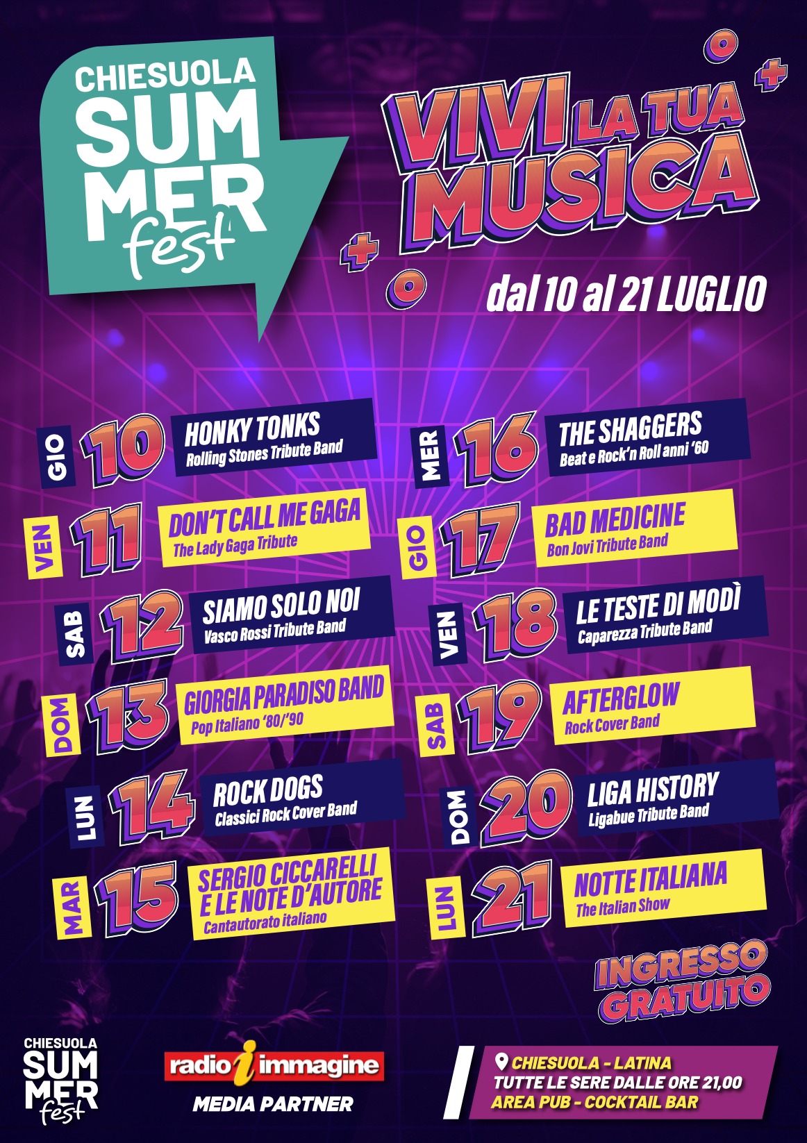 Da domani sera, 10 luglio, fino al 21 luglio, si torna a ballare e a cantare sotto le stelle con la terza edizione del Chiesuola Summer Fest, rassegna musicale tra le più attese dell’estate pontina. Un appuntamento ormai consolidato, che torna a proporre dodici serate consecutive di musica dal vivo, rigorosamente a ingresso gratuito.