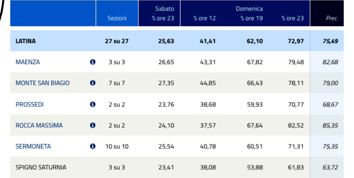 Quasi due ore dopo la chiusura dei seggi, alle 23 di domenica 9 giugno, il Ministero dell’Interno ha diffuso i dati che ora sono definitivi. In media nei sei comuni pontini ha votato circa il 73% degli elettori. Quello di Rocca Massima è il centro in cui l’affluenza è stata più alta, a Spigno Saturnia si conferma la più bassa. Da evidenziare come solo a Prossedi l’affluenza di questa tornata sia più alta della precedente.