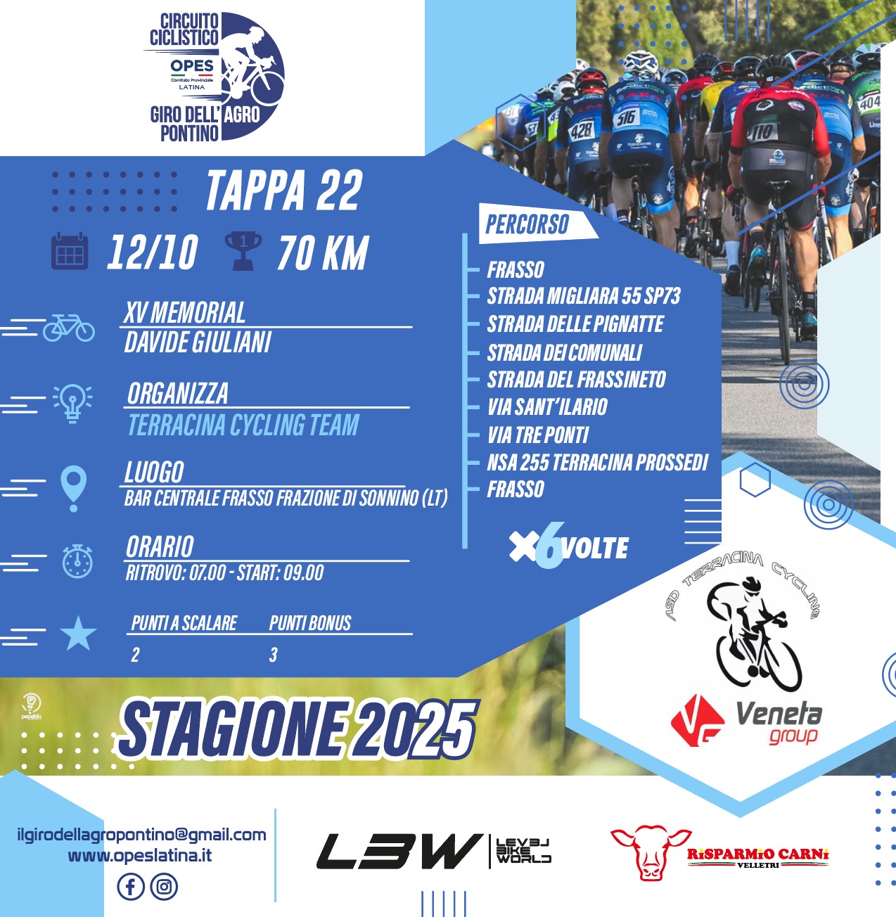 Sarà una domenica di grande ciclismo quella del 12 ottobre, con la 22ª tappa del Giro dell’Agro Pontino Opes, valida come 15° Memorial Davide Giuliani. L’evento, organizzato dal Terracina Cycling Team, si terrà a Frasso (Sonnino) e promette spettacolo e adrenalina su un percorso classico ma sempre insidioso, nel cuore della pianura pontina. Il ritrovo dei partecipanti è fissato alle ore 7:00 presso il Bar Centrale di Frasso, frazione di Sonnino (LT), con la partenza ufficiale alle 9:00.