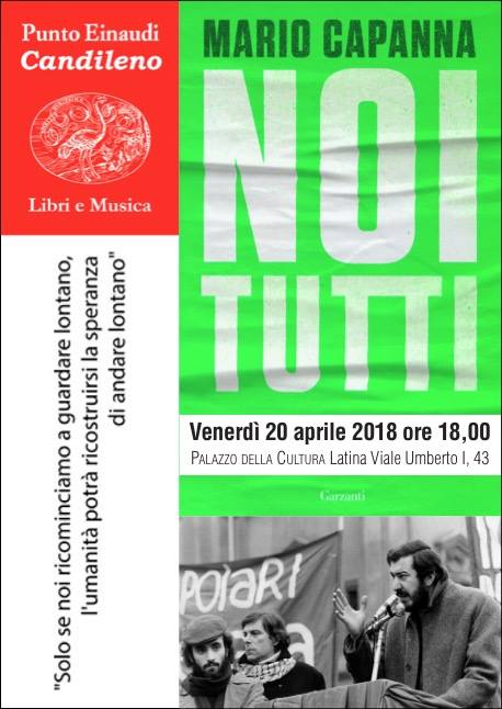 “Mario Capanna torna a parlare del grande fenomeno storico che lo ha visto impegnato in prima linea ma lo fa senza autocompiacimento, nello stile chiaro e lineare che lo contraddistingue”. Così Sergio Sciaudone, esponete del Partito comunista di Latina, su “Noi tutti”, l’ultimo libro di uno dei principali protagonisti del Sessantotto. Capanna, su iniziativa della libreria Candileno-Punto Einaudi, sarà a Latina domani, venerdì 20 aprile 2018, per presentare “l’eredità storica e filosofica di quella stagione”, edita da Garzanti. L’appuntamento è alle 18 presso il Palazzo della Cultura in compagnia di Licia Pastore che introdurrà il tema.