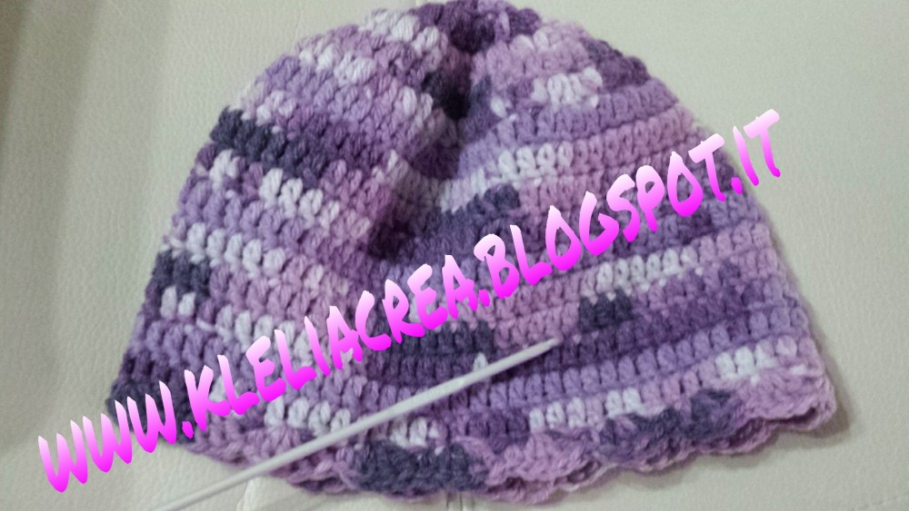 Ciò detto posso spiegarvi , a titolo di esempio , come ho realizzato il cappellino in fantasia viola che misura appunto 55 cm di circonferenza.