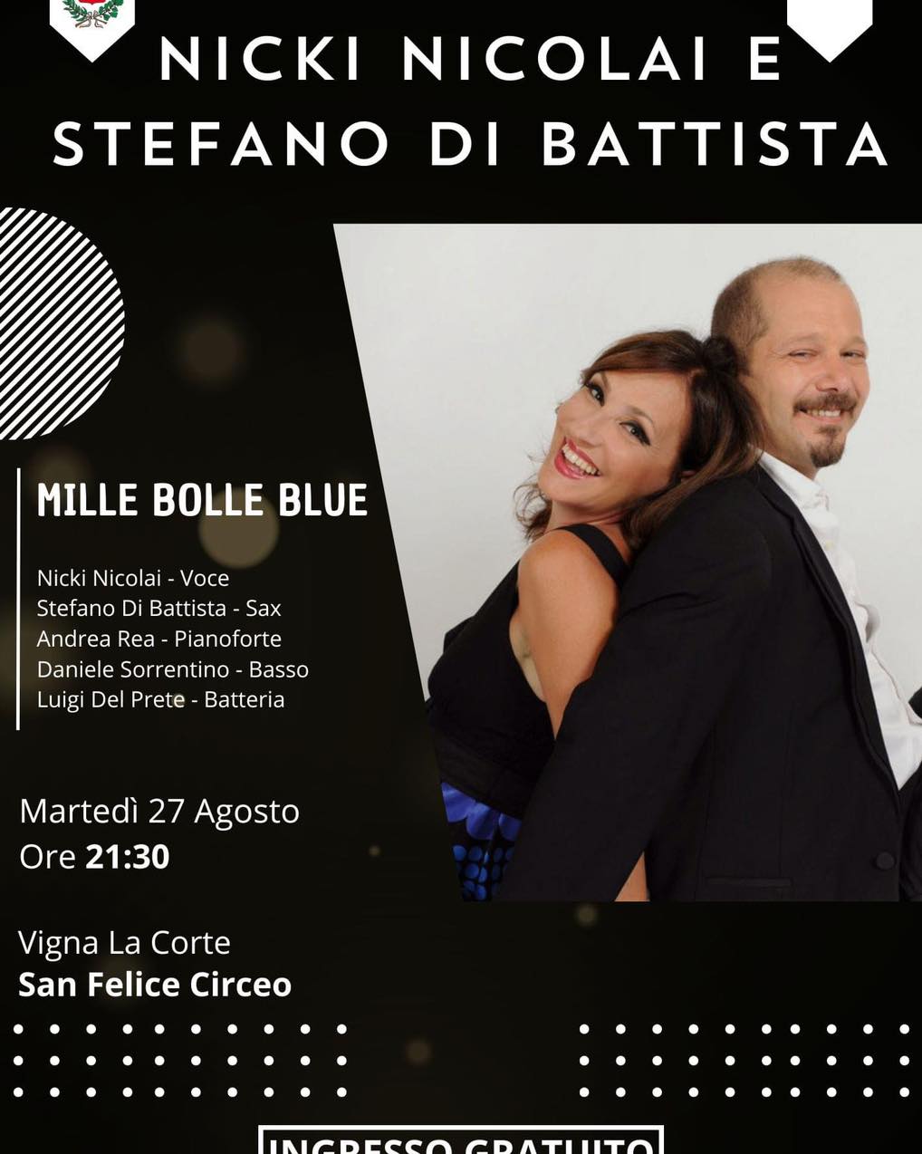 Martedì 27 agosto, alle 21:30, il centro storico di San Felice Circeo ospiterà il concerto “Mille bolle blue” presso la suggestiva Vigna La Corte. Protagonisti della serata saranno Nicki Nicolai (voce) e Stefano Di Battista (sax), accompagnati da Andrea Rea (pianoforte), Daniele Sorrentino (contrabbasso) e Luigi Del Prete (batteria). L’evento, inserito nella rassegna estiva “E…state al Circeo”, offrirà una reinterpretazione jazz e swing di brani iconici della musica italiana e delle più belle canzoni di Nicolai. L’ingresso sarà libero e gratuito. È attivo un servizio navetta e sono disponibili aree di sosta temporanee gratuite lungo via Capponi.