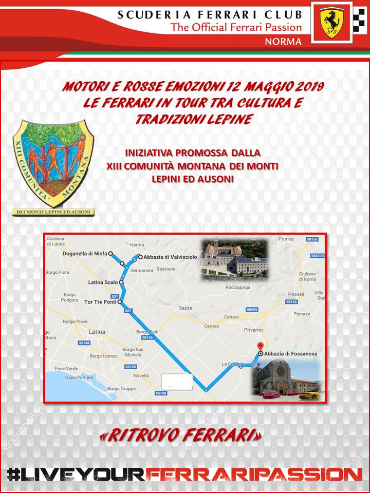 Un entusiasta commento sull’appuntamento è arrivato dal presidente del Club, Benedetto Catalani: “Non posso che ringraziare la XIII Comunità Montana per aver creduto fortemente in questo progetto, incentrato sulla presenza delle Ferrari da intendere come strumento di promozione del territorio e delle sue bellezze. I possessori provenienti da tutto il Lazio e non solo scopriranno il fascino delle due Abbazie e dello splendido paesaggio che le collega, ma anche gli appassionati e i turisti potranno gustare questo binomio visitando l’esposizione delle vetture. Sarà un modo del tutto inedito per questa nuova edizione di “Motori e Rosse Emozioni”: alcune problematiche ci hanno impedito di riproporre a Norma il consueto appuntamento ma stiamo già lavorando per celebrare con un grande evento la ricorrenza dei venti anni di attività del nostro club. Confidando nell’apporto di tutti, posso assicurare che nel 2020 ne vedrete delle belle!”.