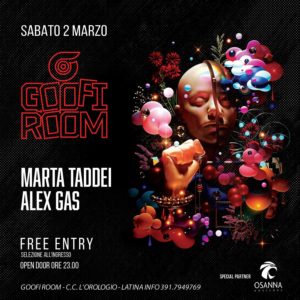 Un nuovo appuntamento per la movida di Latina. Sabato prossimo nella Goofi Room arriva in console Marta Taddei, dj producer che entra subito nella scena underground italiana, esibendosi nei migliori club della Capitale. Il suo sound è una combinazione sintetica tra Minimal e House, rivelando un forte contatto con il dancefloor.