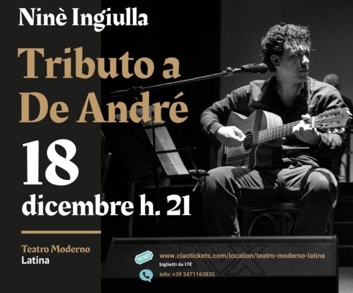 Grazie alla Sara Norcia Eventi, in collaborazione con il giornalista pontino Andrea Lucidi, Niné Ingiulla sarà a Latina sabato 18 dicembre. Il concerto, che si terrà al teatro Moderno con inizio previsto alle ore 21.00, vedrà Ingiulla accompagnato dal polistrumentista Danilo Artale (violino, tastiere, Bouzoki e chitarra). Un percorso musicale che ripercorrerà i più grandi successi di Faber, alternati a brevi interviste che serviranno a far conoscere al pubblico questo particolare artista.