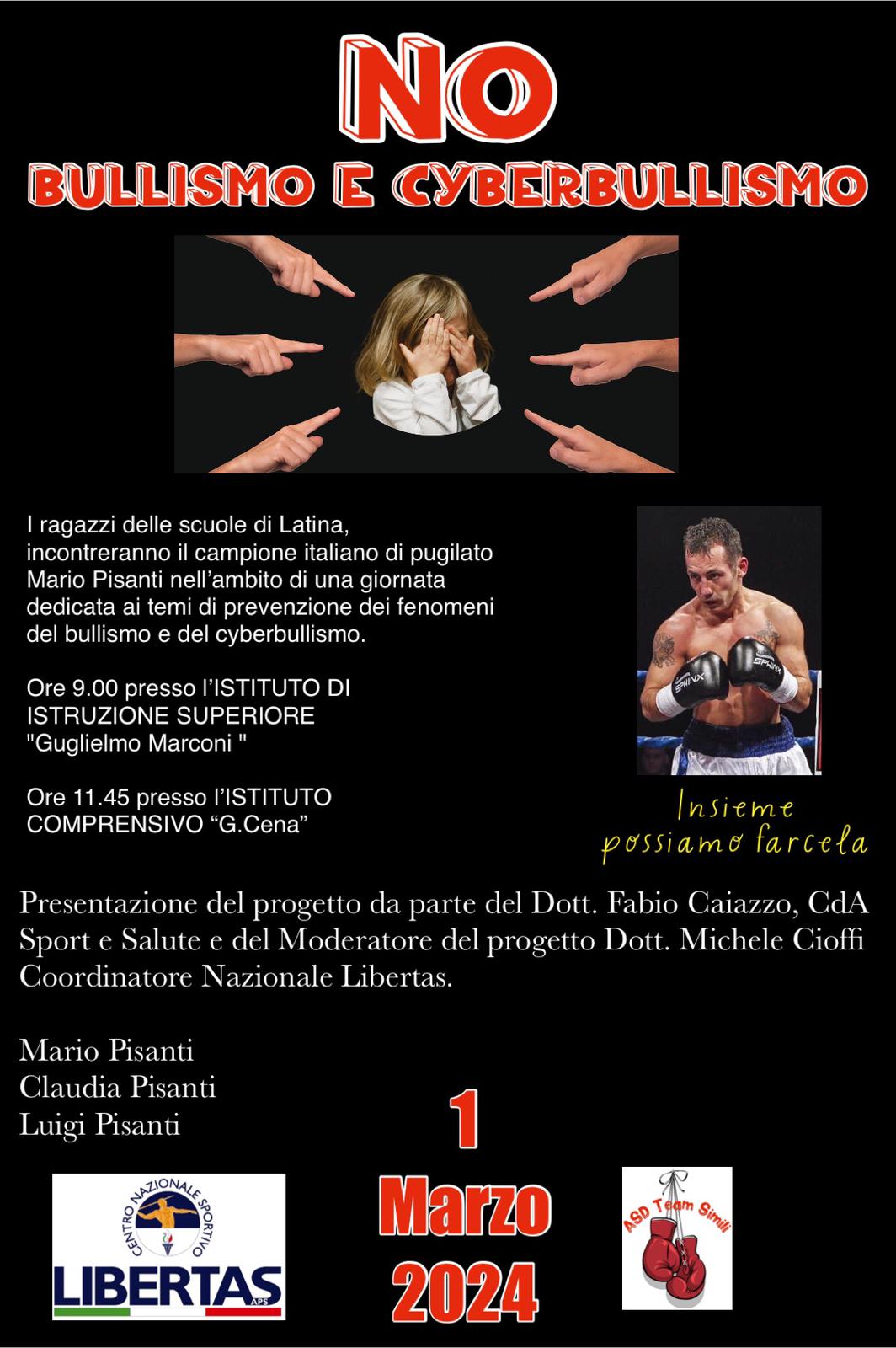 Domani doppio evento per gli alunni di due scuole pontine. In occasione della Giornata dedicata alla prevenzione dei fenomeni di bullismo e cyberbullismo, Mario Pisanti, campione italiano di pugilato, incontrerà prima alle 9 gli alunni dell’Istituto Superiore Marconi di Latina, poi alle ore 11:45 gli studenti delle classi quinte del plesso “Daniele” e “Gionchetto” e le classi seconde della Scuola Secondaria di Primo Grado della Giovanni Cena di Latina.