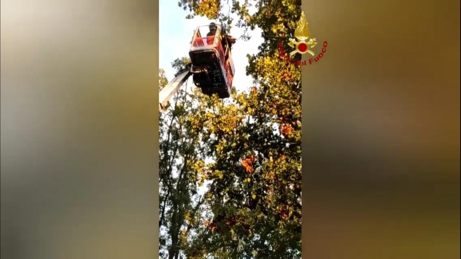 Immediatamente il personale dei vigili ha iniziato le operazioni di recupero con l’utilizzo di un automezzo tridimensionale necessario per recuperare il malcapitato a quell’altezza.