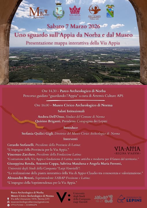 L’iniziativa, curata da Beatrice Cappelletti in stretta collaborazione con la direzione scientifica del museo e l’amministrazione comunale di Norma, punta a far luce sul legame storico tra l’antica città di Norba e il sistema viario romano più celebre al mondo.