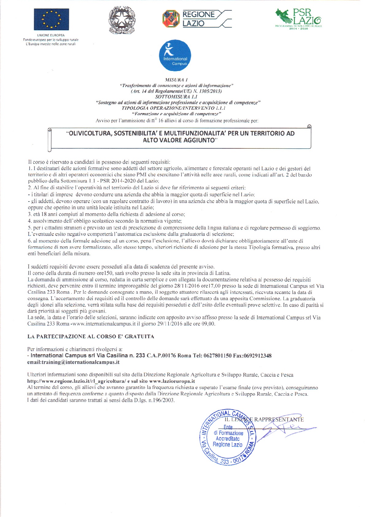 Il mondo olivicolo in primo piano. Si intitola “Olivicoltura, sostenibilità e multifunzionalità per un territorio ad alto valore aggiunto” il corso organizzato dall’International Campus nell’ambito delle azioni formative messe in campo dall’Unione Europea con i Piani di Sviluppo Rurale e attuate dalla Regione Lazio. I destinatari delle misure sono operatori del settore agricolo, alimentare e forestale operanti nel Lazio e altri operatori che siano PMI che esercitano l’attività nelle aree rurali del Lazio.