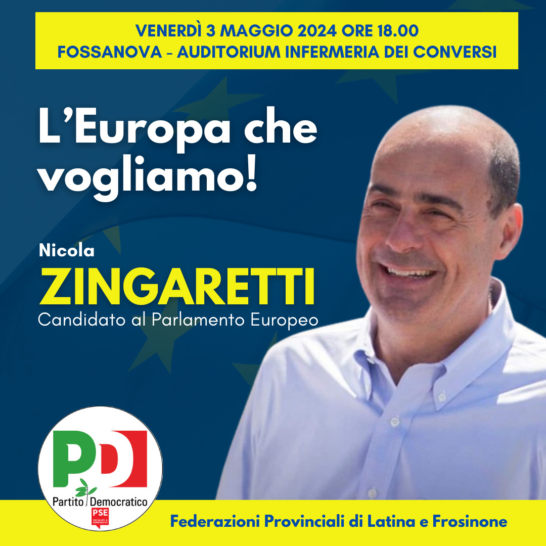 Il 3 maggio, presso l’Auditorium Infermeria dei Conversi a Fossanova, si terrà l’incontro “L’Europa che vogliamo”, organizzato dalle Federazioni provinciali del PD di Latina e Frosinone. Nicola Zingaretti, ex segretario dem, ex presidente della Regione Lazio e candidato al Parlamento Europeo, interverrà ai lavori.