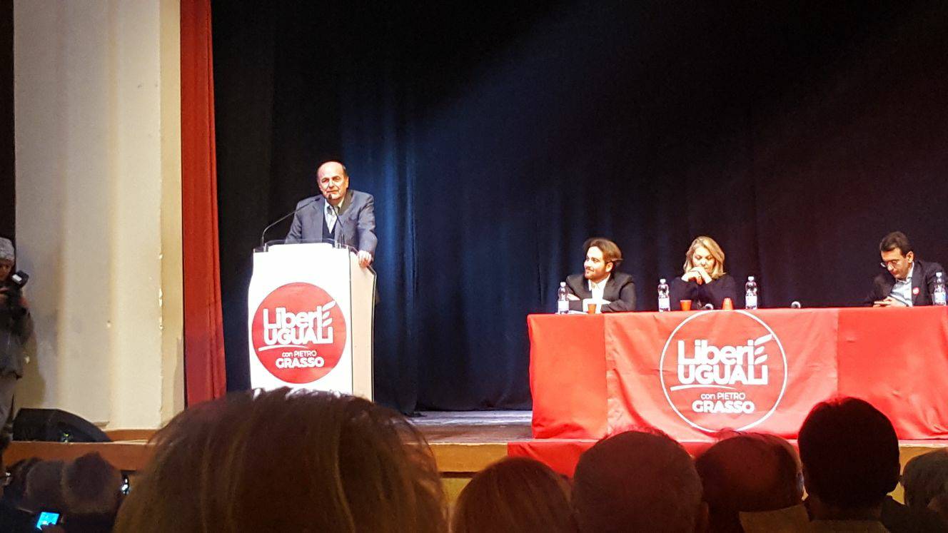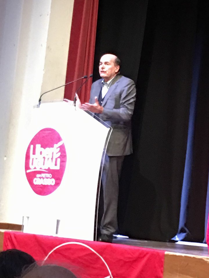 Bersani arriva e prima di entrare in sala si concede ai giornalisti. A testa bassa, elenca quali sono i problemi dell’Italia, che poi ripeterà, ampliandoli di notizie politiche, davanti a un pubblico parsimonioso negli applausi. Niente di nuovo in questo. Fa parte del dna della sinistra, di una certa sinistra, rimanere un po’ distaccati e non farsi travolgere dalle emozioni. “Stiamo recuperando la gente che aveva staccato la spina”, inizia Bersani, un po’ provato dalla campagna elettorale. “Vogliamo ridare dignità a questa sinistra, che ha sempre messo in primo piano il lavoro e tentato di ridurre le diseguaglianze. Ma tante come ora non ce ne sono mai state. C’è dislivello tra i redditi. Il mondo è andato in “frullatore”. Il mondo? Si, Trump per esempio che ha vinto con i voti delle tute blu del Michigan. Le Penn che ha vinto per le banlieue. Quindi si torna subito a casa nostra con Casa Pound che ormai galoppa nelle percentuali.