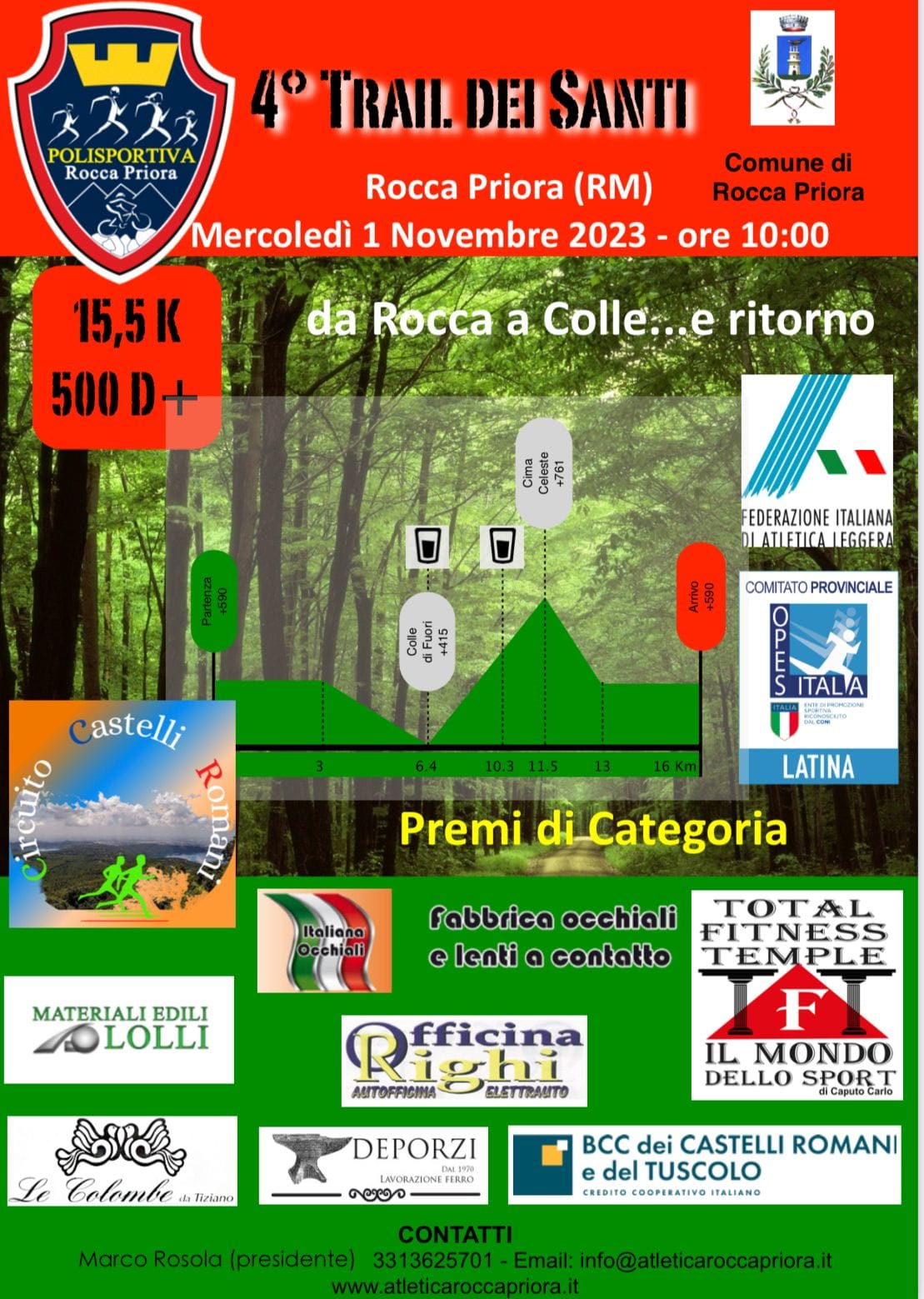 L’evento, organizzato dalla Polisportiva Rocca Priora del presidente Marco Rosola, fa il suo esordio quest’anno nel fitto calendario gare Opes del circuito “In Corsa Libera” come tappa ventisette, ma è già alla sua quarta edizione e darà seguito come quinto ed ultimo appuntamento, alle gare del Circuito dei Castelli Romani, inserite all’interno di In Corsa Libera con lo scopo di promuovere le corse che si svolgono nell’area dei Castelli. Il Trail dei Santi è patrocinato dal Comune di Rocca Priora e sotto l’egida Fidal e Opes.