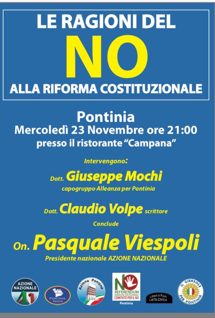 Tutti insieme, per dare forza alle ragioni del no, dopo i saluti di tutti i rappresentanti delle Associazioni introdurrà l’argomento il consigliere comunale Giuseppe Mochi per poi passare la parola allo scrittore Claudio Volpe, giovane talento di Pontinia. Le conclusioni sono affidate all’onorevole Pasquale Viespoli, presidente nazionale di Azione Nazionale già Sindaco di Benevento e Sottosegretario per il lavoro e le politiche sociali.