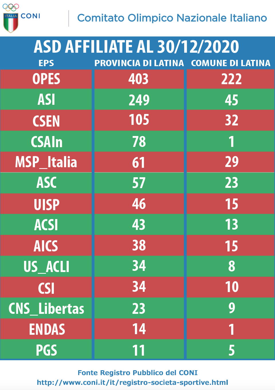 La stagione uscente ne ha segnato e plasmato indubbiamente l’operato, ma nonostante tutto, il comitato chiude l’anno con un bilancio di associazioni affiliate pari a 403 in tutta la provincia e 222 realtà nel solo comune di Latina. Un dato, quest’ultimo, che secondo fonti ufficiali del registro Coni rilevate al 30/12/2020, è numericamente pari a cinque volte quello dal secondo ente in classifica.