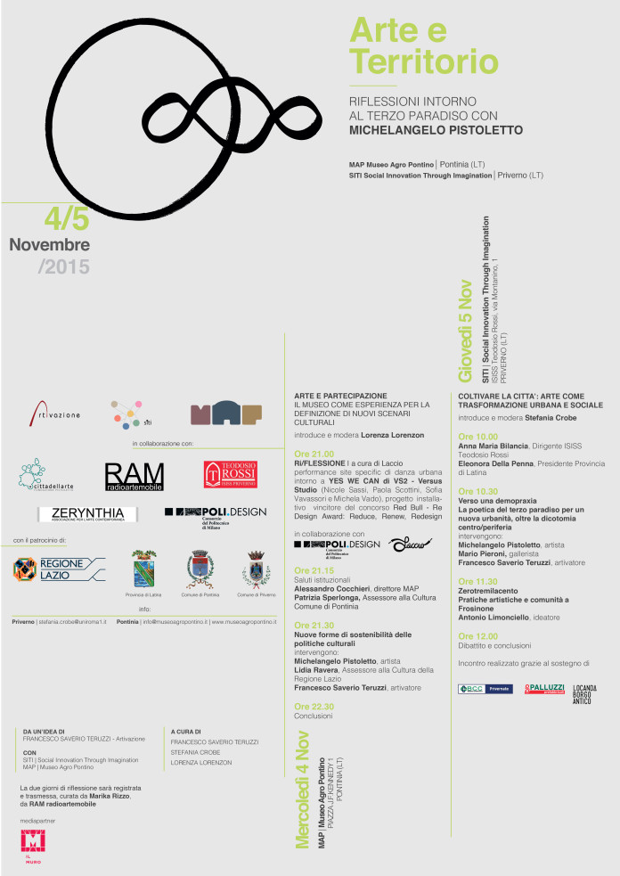 A Priverno, in un incontro aperto a tutti, curato da Stefania Crobe e realizzato insieme all’ISISS Teodosio Rossi, partendo dal manifesto diMichelangelo Pistoletto «Coltivare la città», si rifletterà insieme all’artista, al gallerista Mario Pieroni e a Francesco Saverio Teruzzi sull’arte come agente di trasformazione urbana e sociale, mettendo a confronto, tra teoria e pratica, due esperienze condotte in territori laziali: SITI e Zerotremilacento. Un’opportunità per connettere, ripensando criticamente il processo di urbanizzazione e modificazione dei territori, l’Agro Pontino, i Monti Lepini e la Ciociaria creando una «cerniera» tra la centralità romana e la sua periferia.