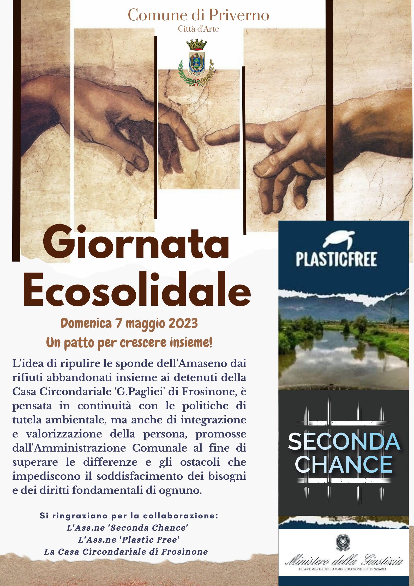 Domenica 7 maggio, il Comune di Priverno, in collaborazione con la Casa Circondariale “G.Pagliei” di Frosinone, e le Associazioni “Seconda Chance” e “Plastic Free”, organizza una Giornata Ecosolidale a Priverno, destinata alla raccolta dei rifiuti abbandonati lungo un tratto del fiume Amaseno.