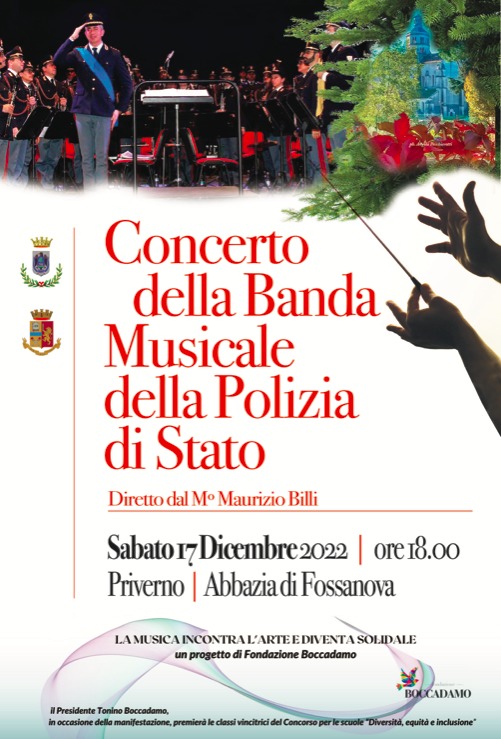 L’evento che vede protagonista una delle orchestre tra le più celebri a livello internazionale, con una storia di successi raccolti negli oltre 80 anni di vita, in Italia e all’estero, è organizzato dalla Questura di Latina e dal Comune di Priverno, ospitato dai Sacerdoti del Verbo Incarnato in una delle cornici più suggestive d’Italia.Il Concerto della Banda Musicale della Polizia di Stato, diretta dal Maestro Maurizio Billi, proporrà al pubblico un repertorio classico, accanto a composizioni originali di autori moderni e contemporanei, con tocchi di note natalizie.