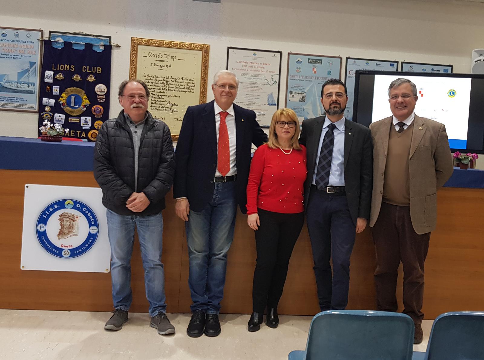 Nella foto da sinistra: il lion Delio Nardella, il relatore lion Enzo Sinno, il dirigente scolastico Maria Rosa Valente, il presidente del Club Giuseppe Giordano, il segretario del Club Marcello Marzocca