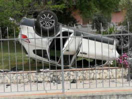 Latina, auto “vola” nel giardino e si parcheggia sottosopra. Incidente in via Monti Lepini