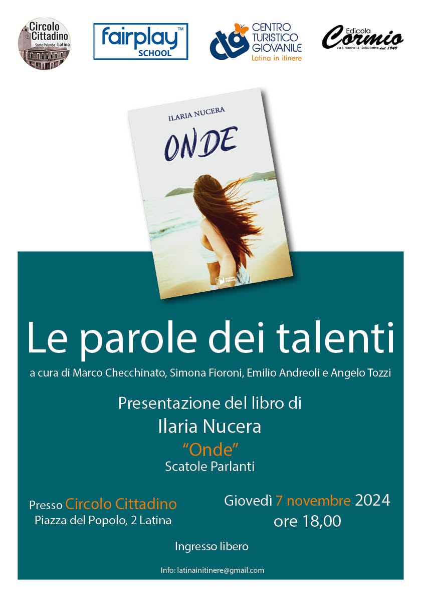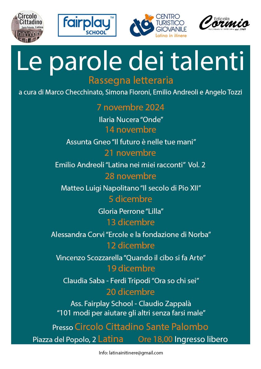La quarta edizione della rassegna letteraria “Le parole dei talenti” prenderà il via il 7 novembre a Latina, con appuntamenti settimanali ogni giovedì alle 18 presso il Circolo Cittadino “Sante Palumbo”. L’evento è curato da Marco Checchinato, Angelo Tozzi, Emilio Andreoli e Simona Fioroni, e mira a creare un contesto di incontro per autori e pubblico, dando spazio a scrittori affermati e meno conosciuti. Gli incontri saranno a ingresso gratuito e offriranno l’opportunità di presentare opere di generi diversi, contribuendo così a valorizzare il panorama letterario locale.