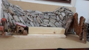 Ho utilizzato un pannello della stessa misura per creare anche la base su cui costruire la mia montagna che altro non è che una serie di legnetti trovati sulla spiaggia che per forma e colore , una volta incollati l’uno vicino all’altro , danno la sensazione della pietra.