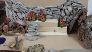 Vi serviranno soltanto un pochino di sughero , dei sassolini e dei legnetti raccolti sulla spiaggia, del muschio, la carta cielo. Qualche statuina e delle casette che potrete anche costruire da soli . Magari un’altra volta vedremo come.