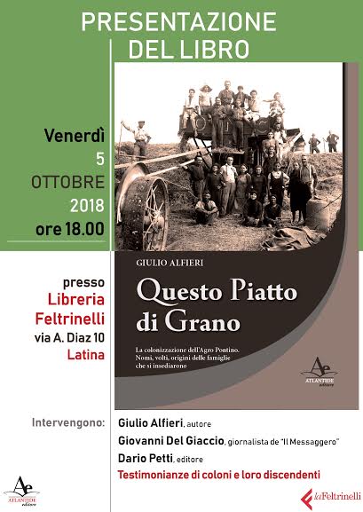 “Questo piatto di grano” approda alla Feltrinelli di Latina. L’appuntamento è per venerdì, 5 ottobre, alle 18 nella sede di via Diaz. Pubblicato da Atlantide editore, il nuovo libro di Giulio Alfieri, già presentato nel capoluogo il 7 settembre scorso al Museo della Terra Pontina, sarà nuovamente al centro di un evento pubblico con l’autore, l’editore Dario petti e il giornalista Giovanni Del Giaccio de “Il Messaggero” che modererà l’incontro.