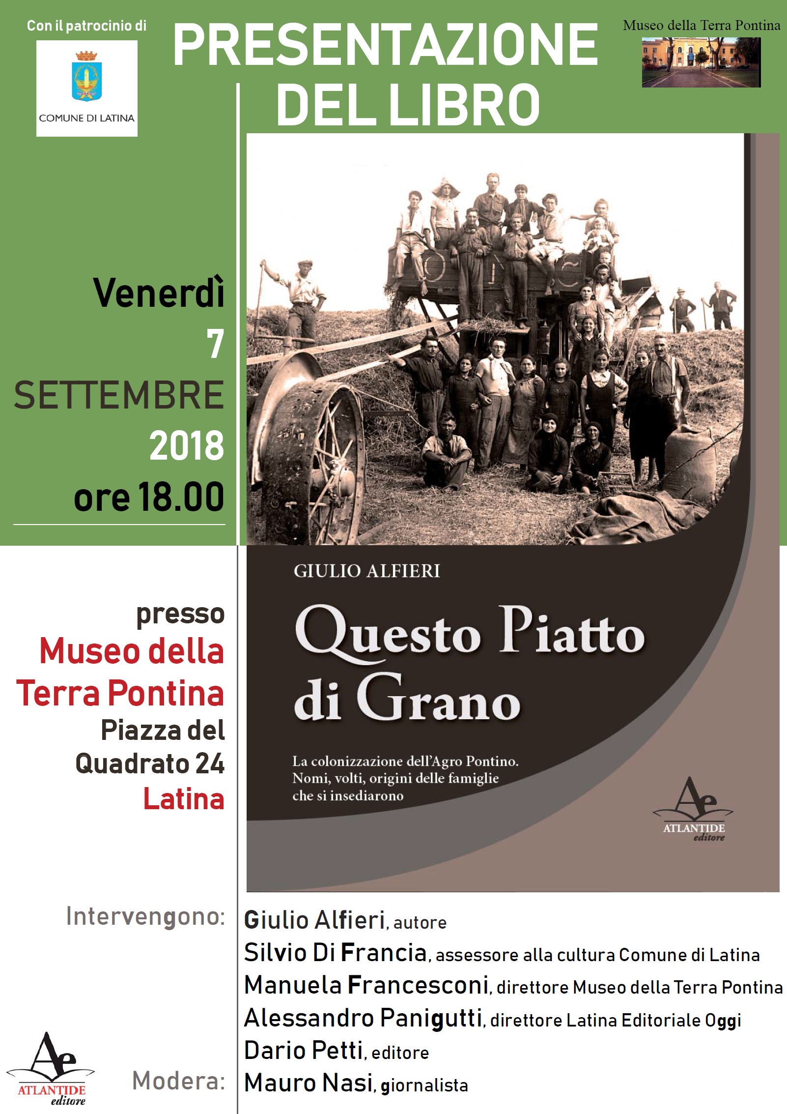 Il Museo della Terra Pontina ospita la presentazione del nuovo libro di Giulio Alfieri. L’appuntamento è previsto per venerdì, 7 settembre, alle 18 presso l’ex edificio dell’Opera nazionale combattenti di piazza del Quadrato a Latina. “Questo piatto di grano. La colonizzazione dell’Agro Pontino. Nomi, volti, origini delle famiglie che si insediarono”, pubblicato da Atlantide editore, che strizza l’occhio alla celebre canzone di Francesco De Gregori “La storia”, punta i riflettori sull’universo dei coloni, circa 4.000 famiglie, tante furono comprendendo quelle costrette ad abbandonare l’impresa e quelle derivate dalle originarie, che si insediarono nei poderi dell’Onc dopo la bonifica operata dal fascismo.