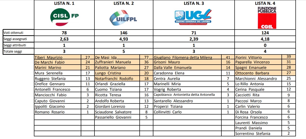 E’ stata la Uil Fp la sigla più votata all’interno del Comune di Latina durante le elezioni per il rinnovo della rappresentanza sindacale con 146 preferenze totali e cinque seggi: eletti Ida De Masi, Manuela Zaffranieri, Mariano Paliotta, Cristina Lungo e Roberto Notarfranchi. La FP Cgil ha ottenuto 124 voti e quattro seggi: eletti Vittorio Fiorini, Vincenzo Paparella, Emanuela Spagni e Barbara Ottocento. Terza classificata la Cisl FP con 78 voti e tre seggi: eletti Maurizio Tiberi, Fabio De Marchi e Marino Marini. Infine l’Ugl con 71 voti e tre seggi: eletti Filomena (Milena) Giugliano, Mauro Grisoni ed Emanuela Dalla Valle.