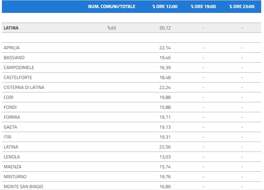 L’affluenza alle urne a Latina e in provincia è del 20,12%, di poco inferiore alla media nazionale pari al 20,14%. Il dato delle 12 ha fatto rilevare che nel Lazio gli elettori pontini che hanno già espresso il voto per il Referendum costituzionale sono i più numerosi. A Roma e provincia l’affluenza è del 19,70%. Di seguito il dato per ogni singolo comune della provincia di Latina, compreso il capoluogo.