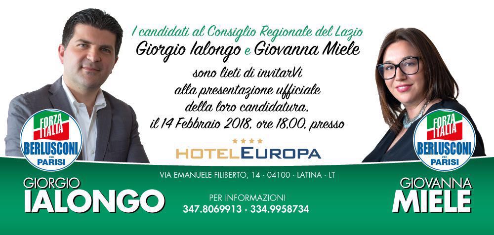 Giorgio Ialongo e Giovanna Miele presenteranno ufficialmente la loro candidatura al consiglio regionale del Lazio mercoledì 14 febbraio alle 18 presso l’Hotel Europa di Latina. Con loro ci saranno Claudio Fazzone, candidato al Senato e coordinatore regionale di Forza Italia, e Alessandro Calvi, candidato alla Camera, e coordinatore provinciale del partito.