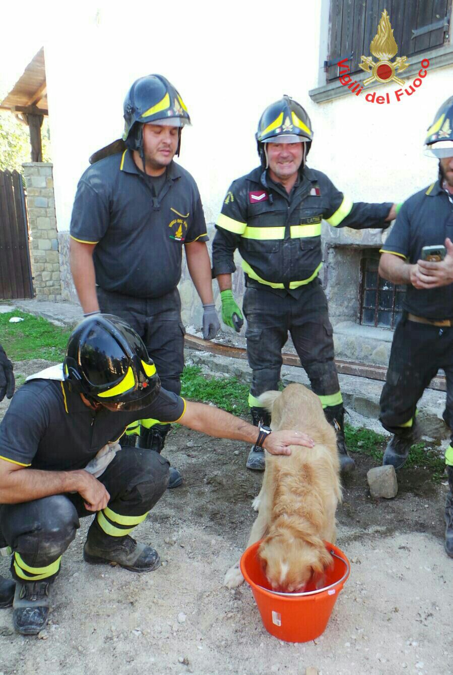 Erano tornati nella loro casa di Villa Santi Lorenzo e Flaviano, frazione di Amatrice, distrutta dal sisma del 24 agosto scorso, per recuperare i loro beni, con il desiderio nel cuore di ritrovare il loro amatissimo cane, Romeno, che da quella notte maledetta non avevano più visto. E così, una volta giunti sul posto, lo hanno chiamato. E incredibilmente hanno avuto risposta: Romeo ha abbaiato da sotto le macerie. Immediatamente, le  sezioni operative dei Vigili del fuoco di Latina, La Spezia e Roma, si sono attivate per  scavare a mano portando alla luce e fuori dalle macerie il cane, amico della famiglia del posto che lo aveva ritrovato. L’episodio si è verificato questa mattina. Romeo finalmente si è ricongiunto alla famiglia di appartenenza dopo aver dato la zampetta ai vigili del fuoco.